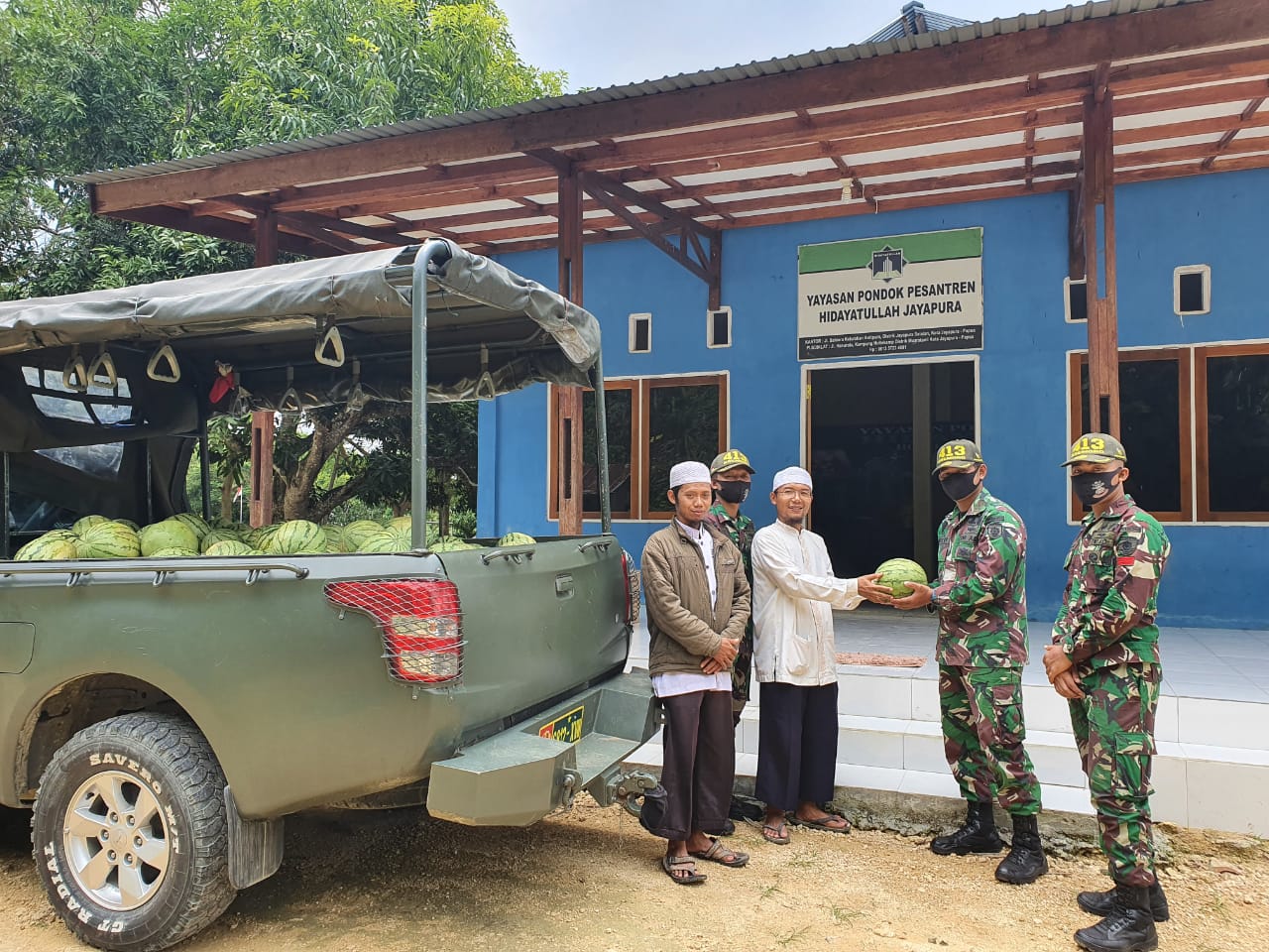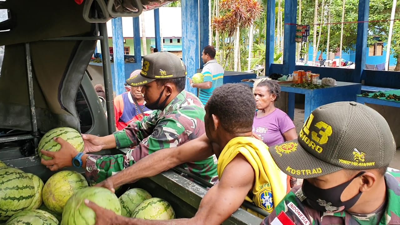 (Jayapura-Papua). Sebagai ungkapan rasa syukur atas keberhasilan Panen Raya dalam memasok ketersediaan bahan pangan di massa Pandemi Covid-19 ini, Satgas Pamtas RI-PNG Yonif Mekanis Raider 413 Kostrad mendistribusikan semangka ke Pondok Pesantren Hidayatullah dan Gereja GKI Petrus yang berlokasi di Kampung Koya Tengah Distrik Muara Tami Kota Jayapura.