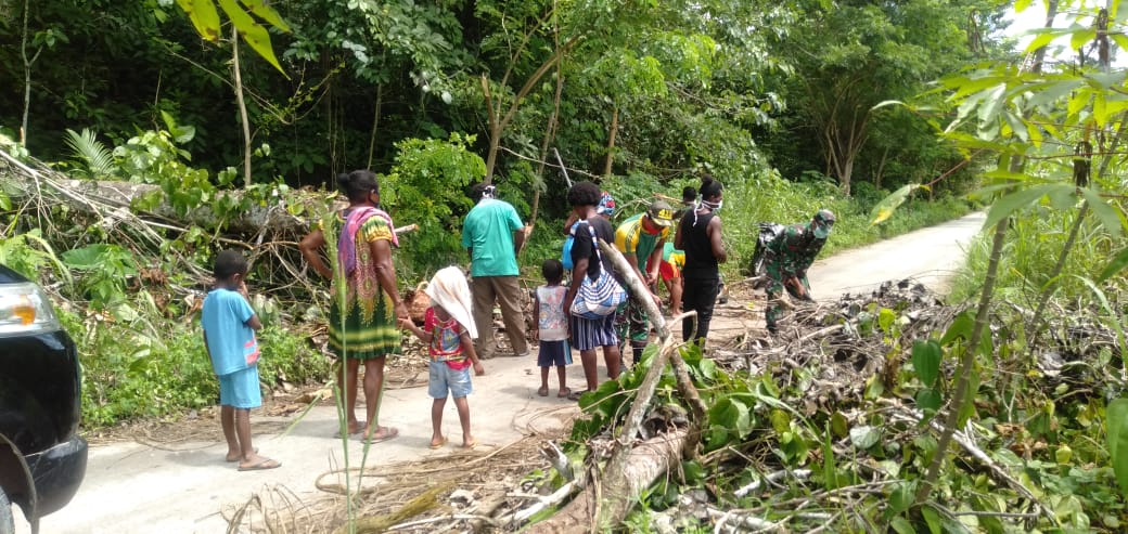 (Jayapura-Papua). Prajurit Satgas Pamtas RI-PNG Yonif Mekanis Raider 413 Kostrad Pos Mosso menggelar Karya Bhakti pasca terjadinya angin kencang disertai hujan yang mengakibatkan pohon tumbang di sepanjang ruas jalan Kampung Mosso Distrik Muara Tami. Demikian dikatakan oleh Dansatgas Yonif MR 413 Kostrad Mayor Inf Anggun Wuriyanto, S.H., M.Han. dalam rilis tertulisnya di Distrik Muara Tami Kota Jayapura, Papua, Rabu (04/11/2020).