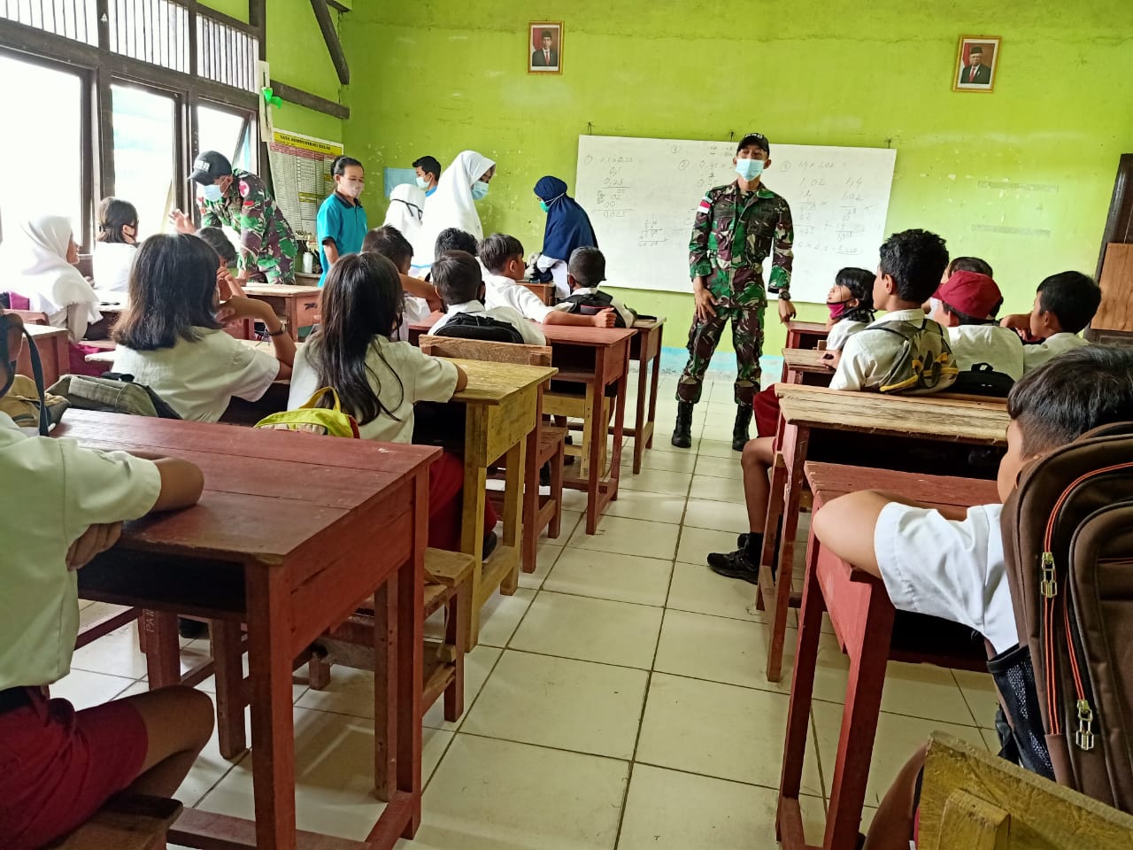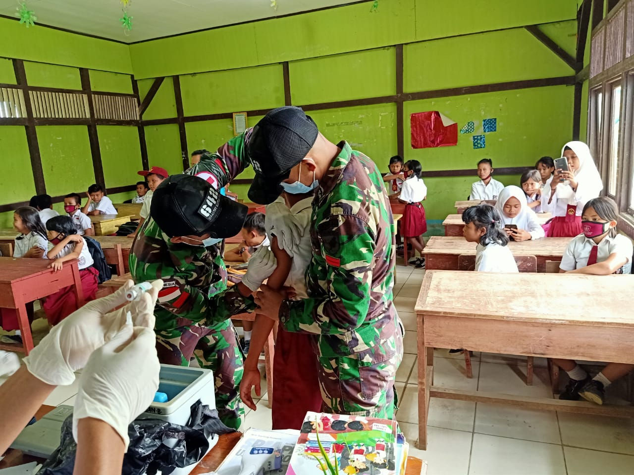 (Sambas-Kalbar). Satgas Pamtas Yonif 642/Kapuas membantu Puskesmas Desa Aruk berikan Imunisasi DPT (Difteri, Pertusis dan Tetanus) kepada siswa-siswi Sekolah Dasar (SD) Negeri 01 Aruk, Desa Sebunga, Kecamatan Sajingan, Kabupaten Sambas, Kalbar, Selasa (24/11/2020).
