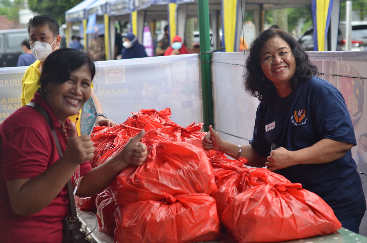 Bukan hanya dikerjakan oleh relawan Muda DPA GBI dan para Bapak-bapak, kegiatan ini juga didukung oleh emak-emak yang diwakili WBI GBI Banten. Para ibu-ibu dari WBI menggelar bazar murah dengan menjual pakaian baru dan pakaian layak pakai, dengan harga miring, yaitu Rp 5.000,- dan Rp 10.000,-. Selain itu, para emak-emak juga membantu dalam pendistribusian tebus murah 1.000 paket sembako senilai Rp 100.000,- / paket, yang bisa ditebus dengan harga yang super miring, cukup dengan Rp 10.000,- saja. Tampak para ibu-ibu melayani masyarakat dengan ramah di tengah masyarakat yang antusia, tetapi tetap mematuhi prokes.