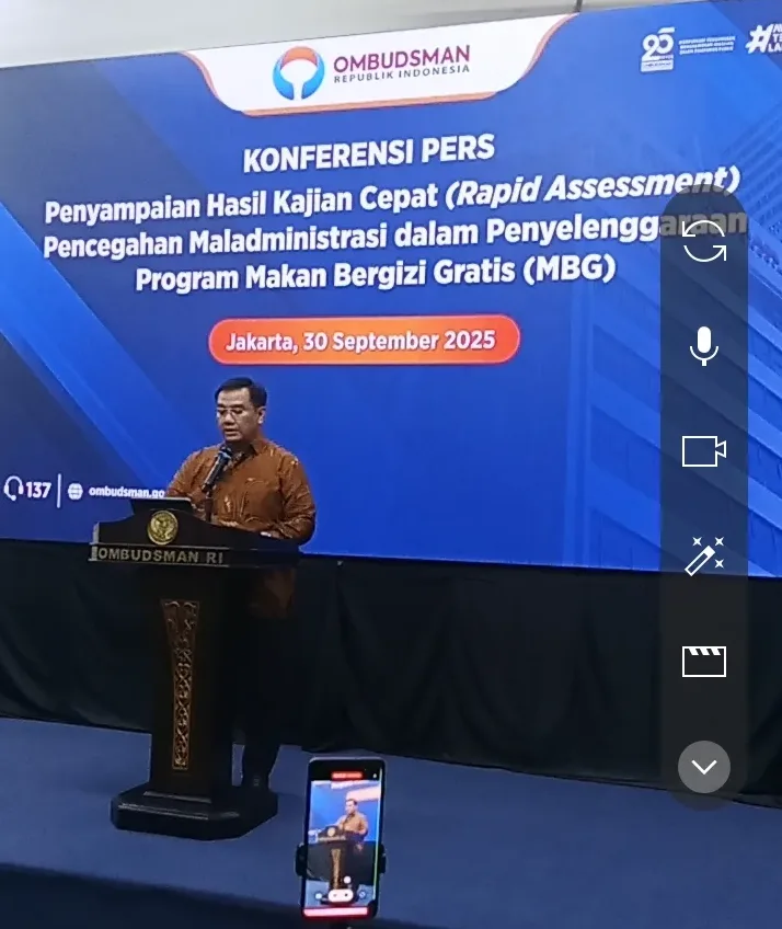 Indonesiannews.co / Jakarta, 30 September 2025 – Ombudsman Republik Indonesia menyelenggarakan Konferensi Pers untuk menyampaikan hasil kajian cepat pencegahan maladministrasi dalam penyelenggaraan Program Makan Bergizi Gratis (MBG). Kajian ini difokuskan pada potensi maladministrasi dalam pelaksanaan program MBG, termasuk pengelolaan anggaran, pengawasan, dan kualitas pelayanan. Hasil kajian menunjukkan bahwa program MBG memiliki potensi risiko maladministrasi yang tinggi, terutama dalam pengelolaan anggaran dan pengawasan. Ombudsman RI merekomendasikan agar pemerintah meningkatkan transparansi dan akuntabilitas dalam pelaksanaan program MBG. Ombudsman RI menekankan pentingnya pencegahan maladministrasi dalam program MBG untuk memastikan kualitas pelayanan dan meningkatkan kepercayaan masyarakat. (***)